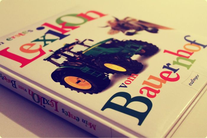 „Mein erstes Lexikon vom Bauernhof „erzählt von Kühen, Milch, Ziegen, Käse, Wolle und aber auch Gemüse und Obst. Ein ganzes Jahr mit der dazugehörigen Arbeit im Herbst, der Weinlese und der Ernte gehört genauso dazu, wie die Betrachtung der Bauernhöfe hier und anderswo. Jede Doppelseite widmet sich einem Schwerpunkt zu den eben erwähnten Gebieten und stellt mithilfe von großformatigen Fotografien und leicht verständlichen kurzen Texten die Welt des Bauernhofs dar.