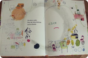Dieses Bilderbuch lässt die kindliche, unbefangene Kreativität hoch leben. Langeweile ist die perfekte Voraussetzung selbst kreativ werden zu können. Und so kombiniert das Mädchen jegliche Techniken und gestaltet mit Buntstiften, Jaxonkreide und Wasserfarben. Sie ergänzt Collageelemente und man könnte gar meinen, dass das Gesicht mit einem Schwämmchen getupft ist.