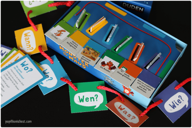 In dieser Geschichtenerzählkiste finden sich zwei Spielvorschläge. Beim Erzählspiel dienen die W-Fragen auf dem roten Faden als Hilfe, die dem Kind den strukturellen Aufbau verdeutlichen sollen. Der spielerische Charakter wird durch das Zufallsprinzip beim Ziehen der kleinen Karten weiter forciert. Zu jeder W-Frage sind Vorschläge vorhanden. Das Foto unten verdeutlicht das Prinzip.