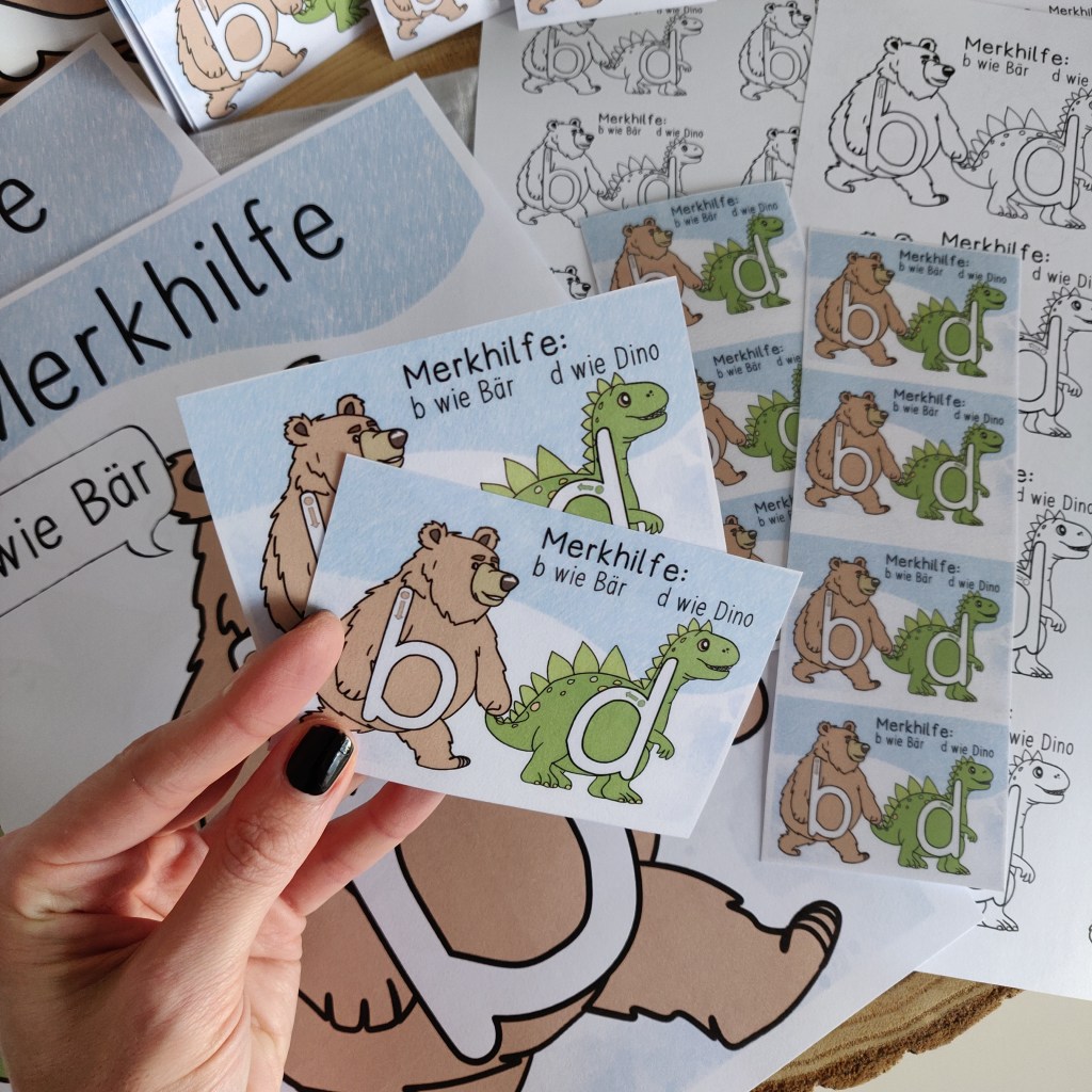 Die Merkhilfen in diesem Material bieten visuelle Eselsbrücken, um sich die Unterscheidung besser und nachhaltiger einzuprägen. Bekanntlich sind Bilder sehr gute Einpräghilfen, die visuellen Lerntypen sehr entgegenkommen. Wichtig ist hierbei zu erwähnen, dass die Tiere stets nach rechts wandern, in die Richtung, in die wir auch schreiben. Das „b“ soll an den Bauch des Bären erinnern, während das „d“ den Rücken des Dinos darstellen soll.