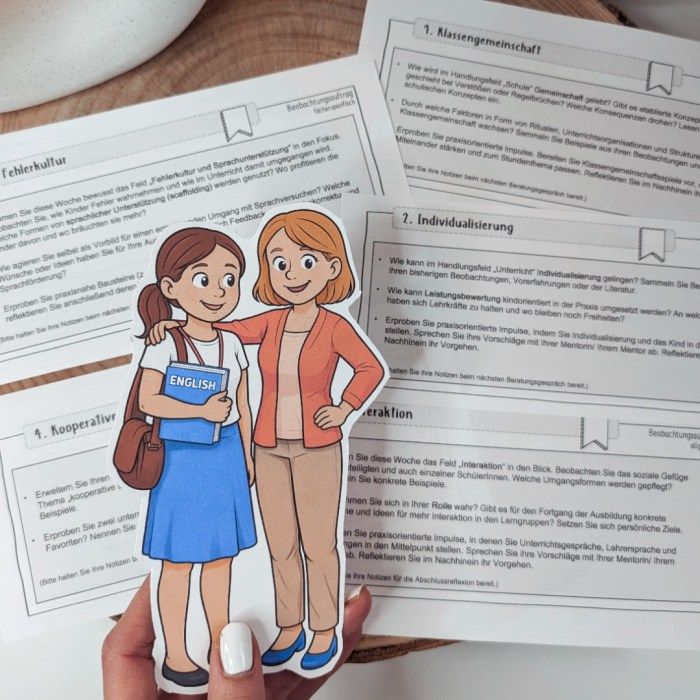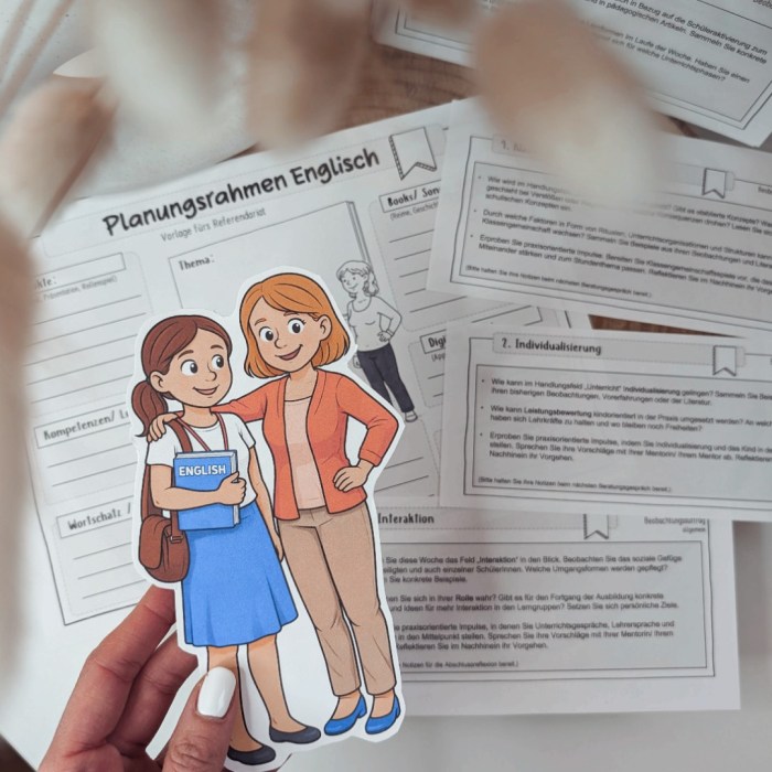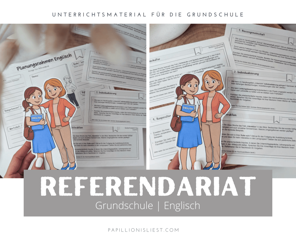 Du bist Englischmentor*in und begleitest Lehramtsanwärter*innen in ihrer Ausbildung?  Das Material bietet eine strukturierte und inspirierende Grundlage für eure regelmäßigen Beratungsgespräche im Fach Englisch in der Grundschule. Mit diesen Vorlagen förderst du eine gezielte Wahrnehmung des Unterrichtsgeschehens und eine reflektierte Auseinandersetzung mit der eigenen Lehrerrolle bei deinen Lehramtsanwärter*innen.