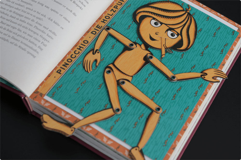 Diese Schmuckausgabe ist ein wahrer Schatz, denn es beinhaltet interaktive Extras, die das Lesen zu einem Erleben machen. Es entfaltet sich eine richtige Theaterbühne im 3D-Effekt, Pinocchio erwacht zum Leben und kann mitsamt all seiner Glieder in Bewegung gebracht werden. Es ist sogar möglich in das Innere eines Hais zu schauen, denn auch dorthin hat es den Holzjungen verschlagen.