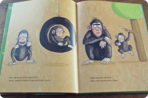 Dieses Bilderbuch mit den farbenfrohen Illustrationen von Stefanie Jeschke hat einen humorvollen Twist zum Ende der Geschichte. Hier findet ein Perspektivwechsel statt, der Kindern erklärt werden muss. Nachdem die Familie die Affen genau beobachtet hat, kommen die Affen als Beobachter zu Wort und müssen feststellen „Wie gut, dass die hinter Gittern sind.“ Dabei sieht der Leser die beiden Kinder vor den Gittern Grimassen schneiden und brüllen, während die Affenfamilie seelenruhig die Zoobesucher bestaunt.