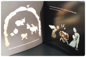 Die Aufmachung ist minimalistisch, modern und ungewöhnlich. Es dominieren die Farben Schwarz, Grau und Gold. Der Text ist einfach gehalten und für Kinder ab 3 Jahren durch die Reduzierung des Wortmaterials sehr gut zu verstehen. Auf den letzten Seiten findet sich ein etwas ausführlicherer Text, der mehr Hintergrundinformationen anbietet. Die Auswahl der Steinformen und die Belichtung der Szenen ist beeindruckend. Es ist wie ein Sog, sodass man sich lange an den Darstellungen erfreuen kann. Gleichzeitig animiert es dazu, selbst kreativ zu werden und Steine als Gestaltungsgegenstände zu nutzen. Die Inspiration ist auf vielen Ebenen mit dieser besonderen Weihnachtsgeschichte von Patti Rokus mehr als geglückt.