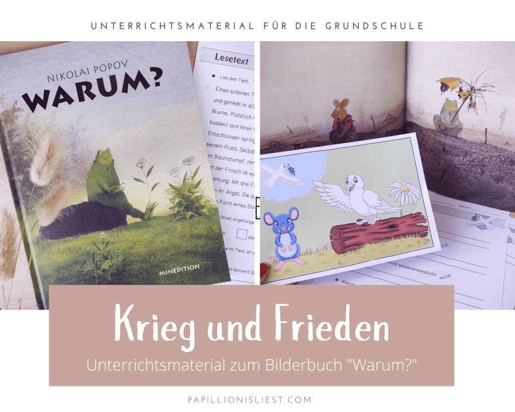 Passender könnte der Titel des Bilderbuchs zur Thematik „Krieg“ gar nicht sein: Warum? Diese Frage füllt den Raum. Hier schwingt Ohnmacht, Unverständnis und Mitgefühl mit. Es bietet wunderbaren Gesprächsanlass für Kinder, sich mit ihren Gefühlen auseinander zu setzen. Es regt dazu an, weiter zu denken und zu überlegen, an welcher Stelle dieser Streit hätte geschlichtet werden können, ohne dass es sich weiter aufbauscht und schließlich derart explodiert. Der Umgang mit den eigenen Emotionen, die Fähigkeit Bedürfnisse zu kommunizieren, die Grenzen des Gegenübers zu wahren – so viele Lernfelder und so wichtige Lernchancen! Es ist unabdingbar, sich dafür Zeit zu nehmen…