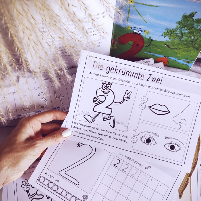 Während das Buch den Kindern im Unterricht vorgelesen wird, dürfen sie die Seiten im Übungsheftchen zu den jeweiligen Zahlen bearbeiten. Hier wurden Zuhör- und Verständnisaufgaben inkludiert. So geht es darum, nur Bilder mit Gegenständen und Dingen auszumalen, die im Buch auch erwähnt werden. Zu jeder Ziffer wurde zudem eine DIN-A5 Seite beigefügt, die das Nachspuren und formklares Schreiben der Ziffern anbietet. Zusätzlich dürfen die Plättchen passend zur Zahl angemalt werden, um die Zahlvorstellung zu stützen.