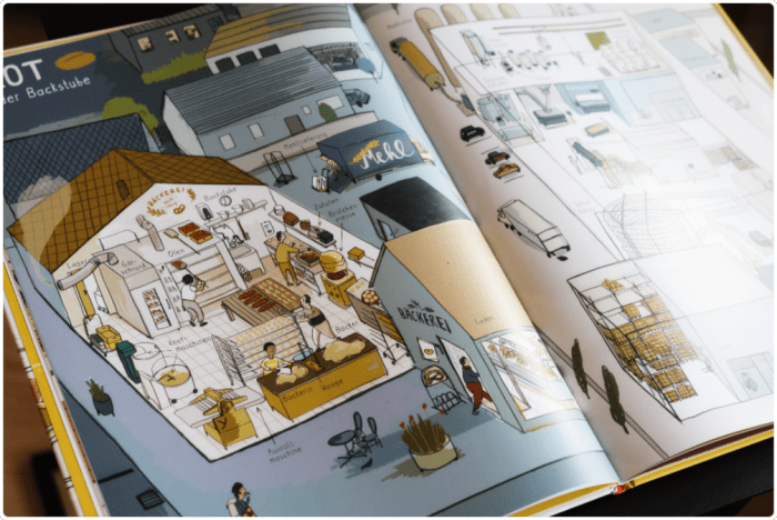 Die Autorin Julia Dürr fuhr quer durch Deutschland und besuchte Apfelhöfe, Milchhöfe, Bäckereien, Schlachtbetriebe, Gemüseanbauorte und Hühnerställe, ließ sich die Herstellung zeigen und machte sich Notizen und Skizzen für dieses großformatige Bilderbuch. Herausgekommen ist ein großer Bildband, mit einzelnen Beschriftungen versehen, der uns einen Einblick gewährt, wie es hinter den Kulissen und im Inneren aussieht. Nach der Darstellung des Betriebs, erfolgt die Beschreibung der Vorgehensweise, Hinweise zu Hilfswerkzeugen und dem gesamten Ablauf. So erfährt der Leser, dass Kühe in Milchbetrieben an Melkroboter angeschlossen werden und es dort automatische Kuhbürsten gibt.