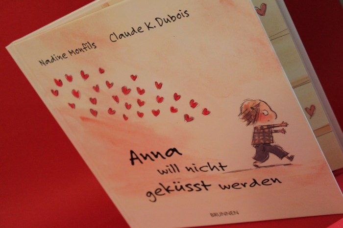 Die Illustrationen sind eine Augenweide. Die Zeichnungen sind minimalistisch und unglaublich liebevoll, sodass man Anna, die mit hinterher fliegenden Küssen schon fast gejagt wird, gleich ins Herz schließen muss. Die Farben sind eher gedeckt und dezent, Naturtöne überwiegen, nur die Küsse sind knallrot und fast überall präsent.