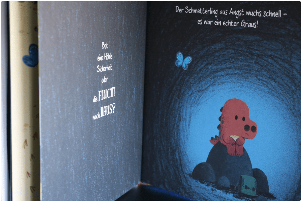 Entmutigt rastet er vorerst und merkt, dass der blaue Schmetterling, das Symbol seiner Ängste, nun anfängt zu wachsen und sich in seiner Gefühlswelt auszubreiten. Wie gut, dass seine Mutter ihm eine „Mut-Mach-Schatzkiste“ mitgegeben hat. Hier finden sich alle Gegenstände, die dafür sorgen, dass seine Sorgen sich in Luft auflösen. Ein Stock, ein Stein, ein Teddy und vor allem Mamas Brief heitern ihn augenblicklich auf und so kann er positiv gestimmt wieder weiterziehen. Er beruhigt sich im Nu und der blaue Schmetterling fliegt wieder aus seinem Bauch.
