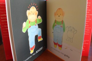 Die Mimik des Affen und die Positionierung im Bild verdeutlicht immer sehr gut, welches Gefühl gemeint ist. Oft werden die gegensätzlichen Gefühlzustände, wie z.B. „confident“ und „shy“ auf einer Doppelseite gegenübergestellt, um den Kontrast zu verdeutlichen.