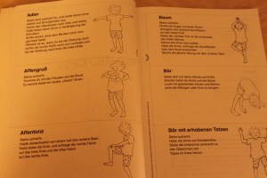 Auf insgesamt 140 Seiten wird eine große Bandbreite an Übungen und Spielen zum Abschalten, Entspannen und Regenerieren präsentiert. Die Yoga-ABC-Kartei (siehe Bild unten) beinhaltet alle vorgestellten Übungen, die meisten davon sind nach Tieren benannt oder stammen aus der unmittelbaren Lebenswelt der Kinder. So können sie sich die Namen viel besser merken und haben einen direkten Bezug dazu. Der Affengruß erinnert sehr stark an das Trommeln eines Gorillas auf die Brust, der Fisch auf einer Flosse ist ebenfalls leicht zu merken, genauso wie die aufblühende Lotusblume.