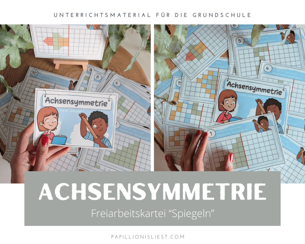 Darauf aufbauend finden unterschiedliche Übungen zum Spiegeln statt. Diese Freiarbeitskartei kann differenziert im Unterricht eingesetzt werden und ist auch für den Förderunterricht gut geeignet. Die Aufgabe ist stets die Teilfigur achsensymmetrisch zu ergänzen. Das Spiegelbild erscheint nun im Vergleich zum Originalbild seitenverkehrt. Die hier rot eingezeichnete Linie ist die Spiegelachse. Dem Material liegt eine Lösungskartei bei. Die Kinder können aber auch selbstständig mit einem Spiegel ihre Ergebnisse kontrollieren. Sofern die Karten laminiert ausgelegt werden, besteht auch die Möglichkeit die Kinder zunächst das Formenbild farblich übertragen zu lassen und anschließend zu spiegeln. Eine Blanko-Vorlage liegt dem Material bei.