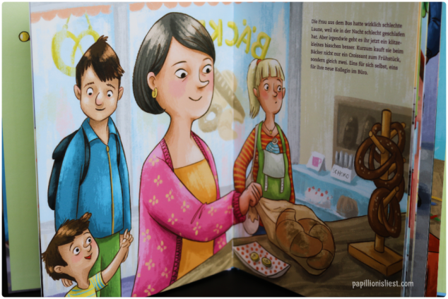 Noah freut sich schon in der Früh auf den Besuch seines Freundes Max. Gut gelaunt und voller Vorfreude sitzt er im Bus einer Frau gegenüber, die griesgrämig drein schaut. Vorsichtig lächelt er ihr zu, doch sie schaut mürrisch weg. Beim Aussteigen grinst er sie an und sagt „Tschüss!“ und da passiert es …ihre Falten auf der Stirn glätten sich. Und hier nimmt der „Domino-Effekt“ seinen Lauf. Etwas besser gelaunt, kauft die Frau beim Bäcker zwei Brötchen und schenkt eins ihrer Kollegin im Büro, die wiederum gut gelaunt mit dem Mann aus dem Nachbarbüro ins Gespräch kommt… Ein kleines Lächeln kann eine große Wirkung haben.