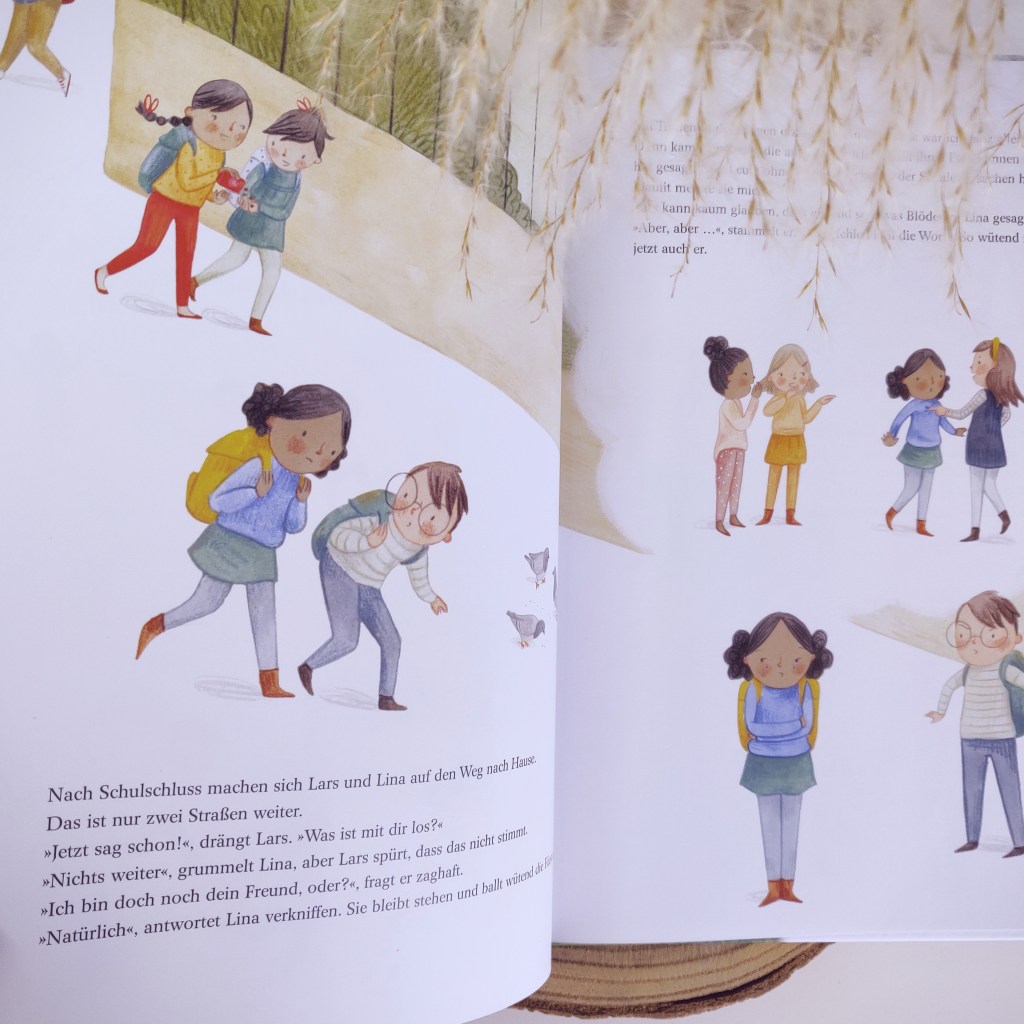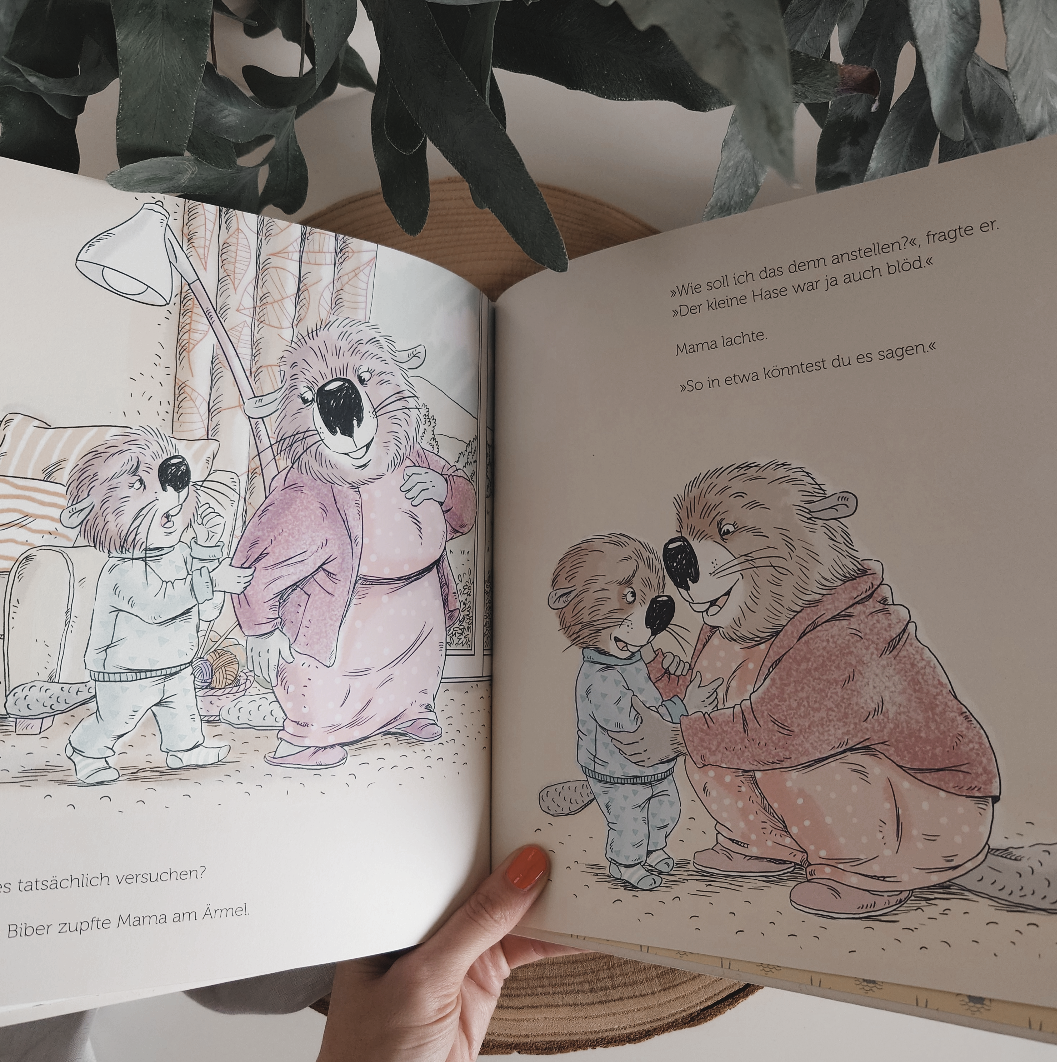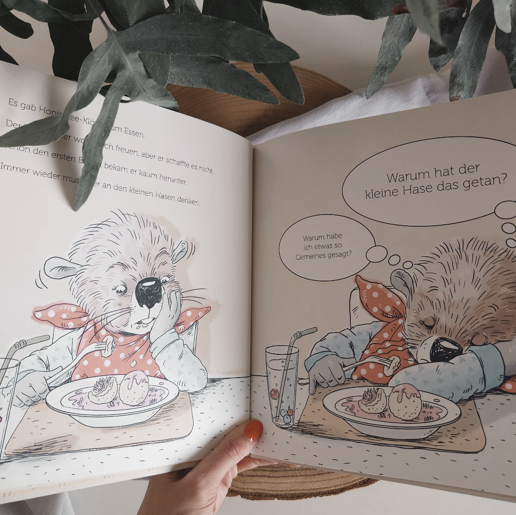 Während der Biber und der Iltis ausgelassen miteinander spielen und fröhlich sind, zieht sich der Hase enttäuscht zurück. Das entgeht auch dem Biber nicht und etwas in seinem Bauch zieht sich zusammen. Die Schuldgefühle wiegen schwer. Als seine Mutter ihn abholt, merkt auch sie, dass etwas nicht stimmt. Er hat keinen Appetit und macht sich Vorwürfe, dem Hasen die Freundschaft gekündigt zu haben. Der Biber vertraut sich seiner Mama an und sie stellt ihm Fragen, die als wunderbare Denkanstöße dienen und den Perspektivwechsel fördern.