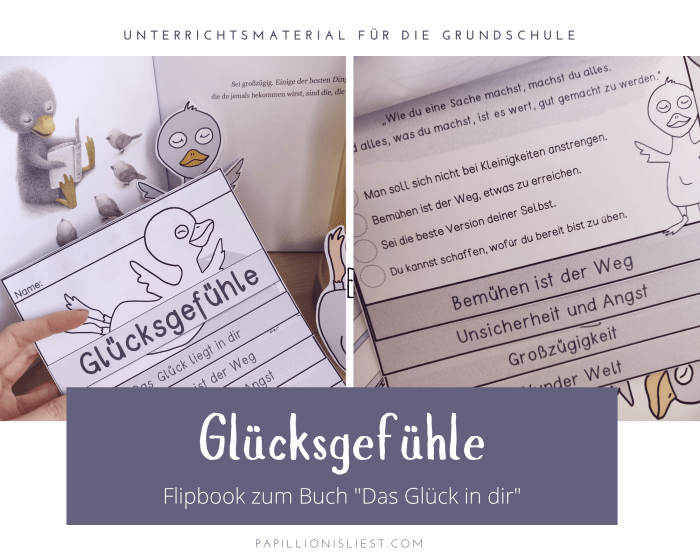 Inhaltlich geht es um körperliche Anzeichen von Glücksgefühlen, aber auch die eigene Wahrnehmung von Glücksmomenten. In einem Buchstabengitter dürfen Begriffe gesucht werden, die im Bilderbuch auftauchen oder ein Lückentext sinnvoll ausgefüllt werden. Die wichtige Erkenntnis bleibt jedoch die Botschaft des Bilderbuchs, dass das Glück in jedem von uns wohnt.