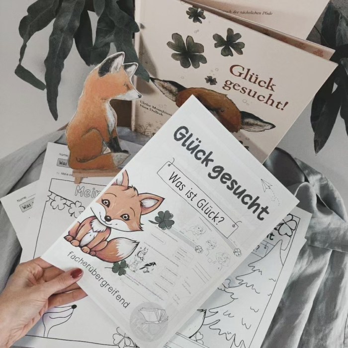 Das Bilderbuch „Glück gesucht!“ von Ulrike Motschiunig fokussiert genau diesen inviduellen Ansatz. Zur Geschichte wurde passend Unterrichtsmaterial erstellt. Es ist eine Zusammenstellung an Arbeitsblättern, die sich um die Thematik „Glück“ dreht. Es sind Aufgabenformate berücksichtigt worden, die in den Jahrgängen 1-4 eingesetzt werden können.