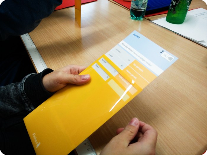 Für die Bearbeitung der Aufgabenkarten werden Einstecktaschen benötigt. Im Lieferumfang befinden sich insgesamt 9 Taschen, wobei die Karten ausschließlich mit  der entsprechenden Farbe des Täschchens bearbeitet werden können. Damit geht einher, dass für eine Klasse mindestens zwei Sets an zusätzlichen Einstecktaschen bestellt werden müssen. Diese verdecken vorerst die richtige Antwort und erst nach dem Hochschieben, wird das richtige Ergebnis gelüftet. Nach der Erprobung im Deutschförderunterricht meldeten die Kinder zurück, dass sie es als sinnvoll erachten, dass man nicht gleich geneigt ist herüber zu linsen, sondern tatsächlich erst für sich überlegen muss. Da die Rückmeldung unmittelbar erfolgt und nicht erst nach dem Bearbeiten der ganzen Seite, bleibt es besser „im Kopf hängen“, so die Einschätzung der Kinder.
