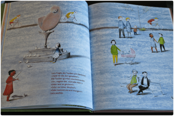 Ein poetisches Buch mit vielen philosophischen Gedanken, verpackt in zarte Buntstiftstriche, die den Leser in pastellfarbigen Illustrationen durch die Geschichte tragen. Die Zeit ist Laras Freund. Anders als ihre Familienmitglieder, versucht sie nicht die Zeit zu vertreiben oder sie gar totzuschlagen. Auf der Suche nach der verschollenen Zeit, erlebt sie, dass Menschen sie kaum zu haben scheinen, sie eilen unaufhörlich und behaupten, dass Zeit Geld sei.
