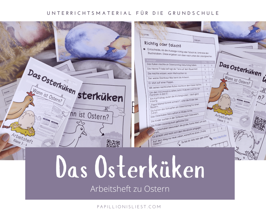 Hier gehen sie den Hinweisen nach und ermitteln den Tag des Vollmondes und wenden den Trick mit dem Frühlingsanfang an. Ein Quiz rund um die Geschehnisse im Buch prüft das Lese- bzw. Hörverständnis ab. Im Arbeitsheft wurde ein QR-Code eingebaut, sodass die Schülerinnen und Schüler sich bei Unsicherheit das Bilderbuch und damit die Geschichte erneut online anschauen und anhören können.