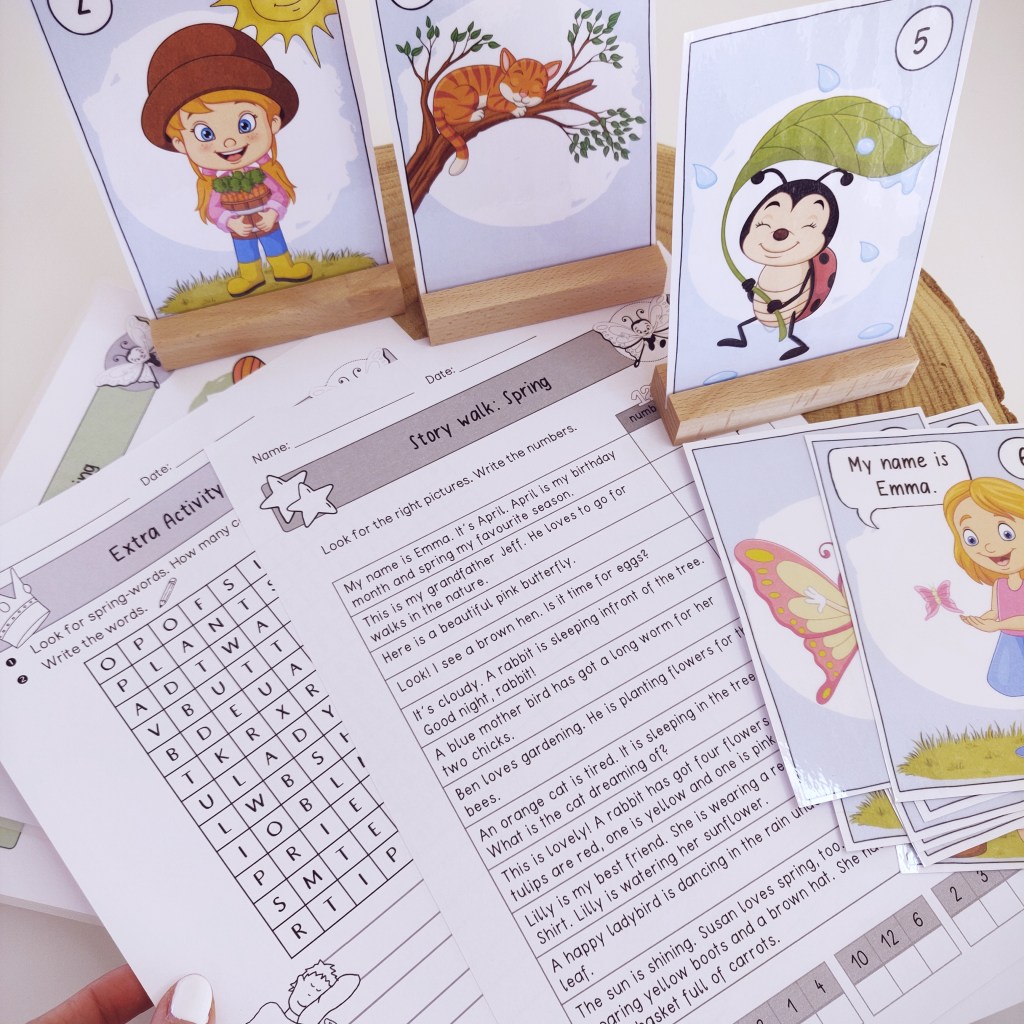 Der Frühling klopft an die Tür. Lesespaziergänge sind eine wunderbare Methode, um Kinder zum Lesen, auch in der Fremdsprache Englisch, zu motivieren. Der Story Walk „Spring“ fördert das sinnentnehmende Lesen und spornt die Schülerinnen und Schüler an, ihr Leseverständnis unter Beweis zu stellen. Die bunten Karten mit den unterschiedlichsten frühlingshaften Motiven sollen gut verteilt im Klassenraum, im Flur oder auch gerne bei wärmeren Temperaturen im Freien aufgehangen bzw. platziert werden.