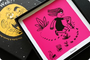 Die Vorderseite der Karte zeigt ein Mädchen auf dem Boden sitzend, wie sie mit einem Bleistift eine Ameise aufpikst und laut ruft „Erwischt!“. Ist das grausam?