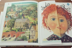 Tiere verwandeln sich in vermischte Lebewesen, mit Hühnerbeinen und Hörnern. Mit jeder Klappe wird der Kopf, der Mittelteil oder die Hinterbeine verändert. Eine Stadt steht Kopf und simuliert eine optische Täuschung. Auf einem Drehrad mit unterschiedlichen Kopfbedeckungen werden Menschen nach Lust und Laune neu bekleidet. Es finden sich auch bekannte Malereien wie der Gemüsekopf von Giuseppe Arcimboldo wieder. Motive, die stark an René Magritte erinnern, werden eingestreut, mit der Absicht herkömmliche Erfahrungs-, Denk- und Sehgewohnheiten zu erschüttern und Wirklichkeit mit Traum zu vermischen. Ein niedliches Gesicht eines Mädchens wird beim Aufklappen zu einem unheimlichen Zwerg. In den Wolken werden tierische Gestalten versteckt.