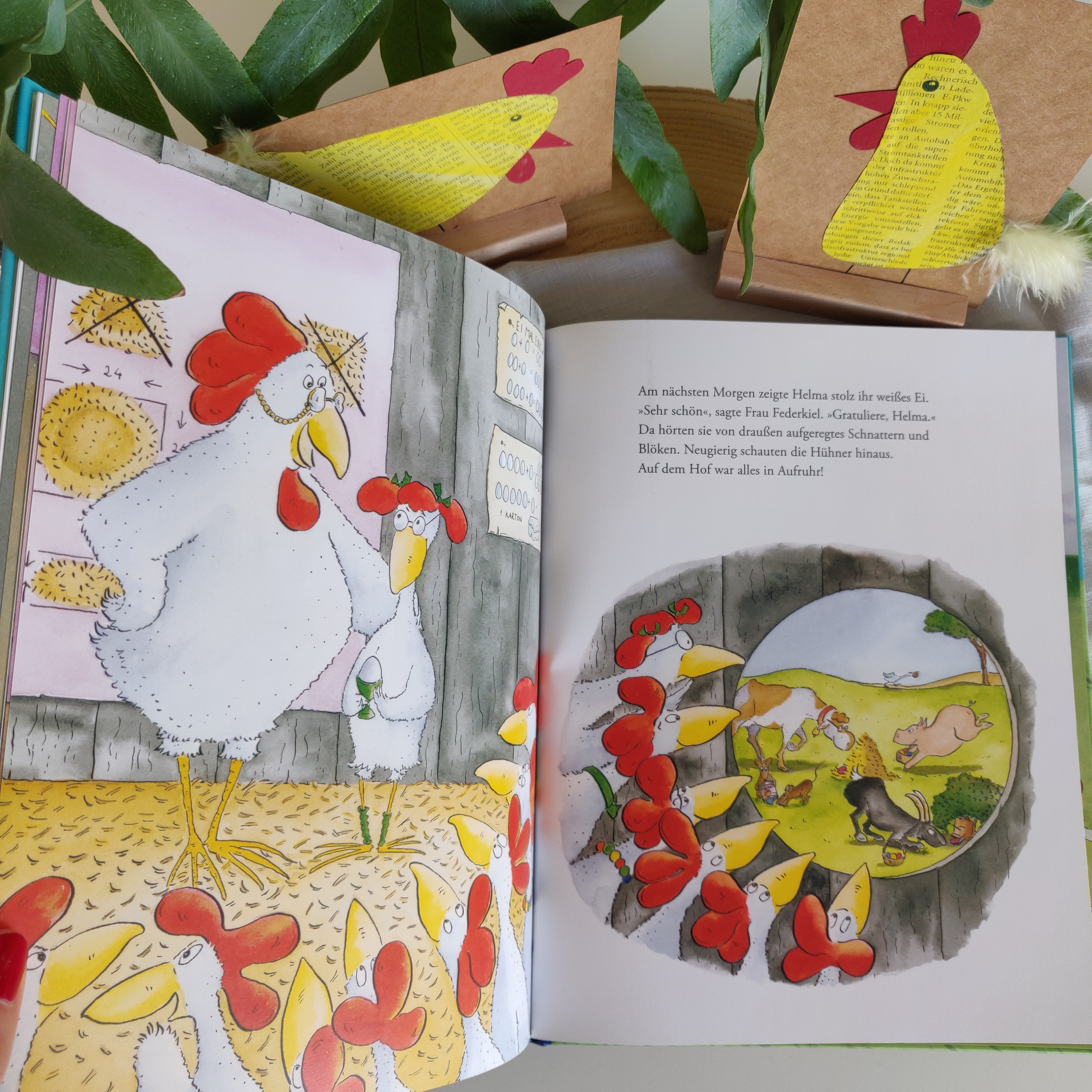 Helma ist eine fleißige Henne, der das Legen von weißen Eier nicht gelingt. Dabei bekommt sie in der Hühnerschule von ihrer Lehrerin täglich erklärt, wie das perfekte weiße Ei auszusehen hat. Die Henne legt jedoch ausschließlich bunte Eier. Dabei trinkt sie schon Milch, isst Reis und denkt an weiße Dinge. Als sie nicht mehr weiß, wohin mit der Unmenge an bunten Eiern, entschließt sie sich als Osterhase zu verkleiden und diese zu verstecken.