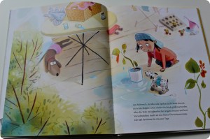 Dieses Bilderbuch ist ein Schatz, gespickt mit wertvollem Wissen rund um den Garten. Kinder lernen Fachbegriffe, wie z.B. „Setzlinge“, „mulchen“ oder „Dolde“, erweitern somit ihren Wortschatz und sammeln immer mehr Fachwissen-Informationen. Diese Tipps und Tricks nimmt Sophie mit in die Stadt und legt auf dem Balkon einen kleinen Gemüsegarten an. Schon bald bekommt sie von Freunden Besuch und dann sitzen sie dort auf dem letzten Bild und naschen genüsslich selbst angepflanzte Kirschtomaten.