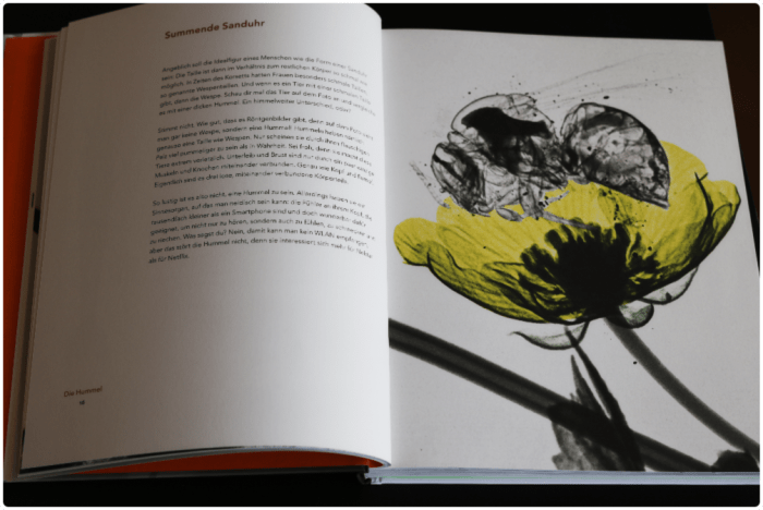 Die Aufnahmen werden auf stolzen 124 Seiten gesammelt und in folgende Kategorien unterteilt: Gliederfüßer und Weichtiere, Fische, Amphibien, Reptilien, Vögel und Säugetiere. Der Fotograf hat sie auf Pflanzen platziert, sodass sie hier und da auch mitauftauchen und man so eine Hummel auf einen Blütenkelch zusteuern sieht. Begleitet werden die Bilder von umfangreichen Informationstexten, sodass die Altersangabe von 8 Jahren als sehr passend erscheint. Begrifflichkeiten wie „Pedipalpen“ werden eingestreut und mit Erklärungen bestückt. Sehr schnell erkennt man den Ursprung der Bezeichnung „Wespentaille“, wenn man sich eine Hummel anschaut. Man erfährt, dass Riesengarnelen ihr Skelett nicht so wie wir Menschen im Inneren tragen, sondern außen. Im Leib befindet sich kein einziger Knochen, sodass die Röntgenaufnahme lediglich den Darm entlarvt. Die Texte lesen sich wie eine Erzählung eines Großvaters, der seine Enkel in seine Ansammlung an Wissen einweiht. Der Autor stellt viele Fragen und beugt damit einem reinen Informationsvortrag vor, vielmehr erzeugt er das Gefühl einer hautnahen Interaktion.