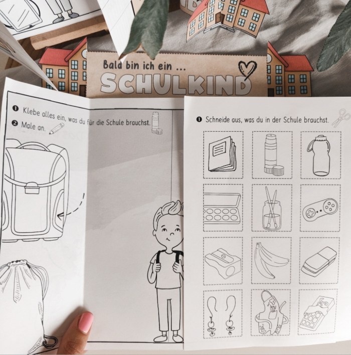 Im Faltbuch wird festgehalten, was Schulkinder an Schulsachen benötigen. Es gibt zwei Möglichkeiten des Einsatzes. Weniger aufwendig ist die Aufgabe, die Gegenstände anzumalen, die man in der Schule braucht. Etwas anspruchsvoller und zeitlich umfangreicher ist das Aufgabenformat, die Schulsachen auszuschneiden und in die Blattmitte einzukleben. Zum leichteren Falten des Büchleins wurde eine Faltlinie berücksichtigt. Das Hochkopieren auf DIN-A3 ist empfehlenswert.