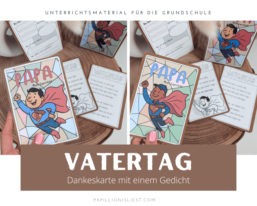 Diese Dankeskarte kann als Vatertagsgeschenk zum Vatertag genutzt werden und bietet eine liebevolle Möglichkeit, einem Vater oder einer anderen männlichen Vertrauensperson (z. B. Opa, Onkel, Stiefvater, großer Bruder) Danke zu sagen. Das Material richtet sich an Grundschulkinder und enthält ein differenziertes Gedicht in einfacher, kindgerechter Sprache, das je nach Leistungsstand abgeschrieben oder auswendig gelernt werden kann. Dieses Gedicht liegt in einer Strophe oder bei Bedarf auf Erweiterung in zwei Strophen vor. Eine ausdrucksstarke Malvorlage im Superhelden-Stil rundet das Material ab und fördert die kreative Auseinandersetzung mit der Thematik.