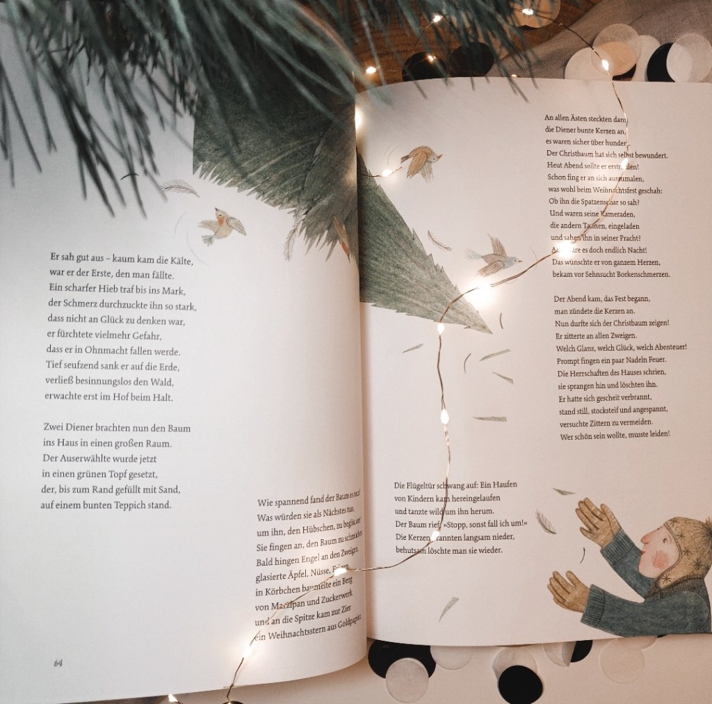 Die zarten Illustrationen lassen einen träumen und hüllen die Botschaften in einen warmen Schleier. Mit dieser Buchempfehlung wünsche ich Euch märchenhafte Weihnachten mit wertvollen Momenten, statt materiellen Geschenken und hoffe, dass ihr so weise wie der alte Tannenbaum, die Zeit mit euren Lieben genießen könnt. Frohe Weihnachten!