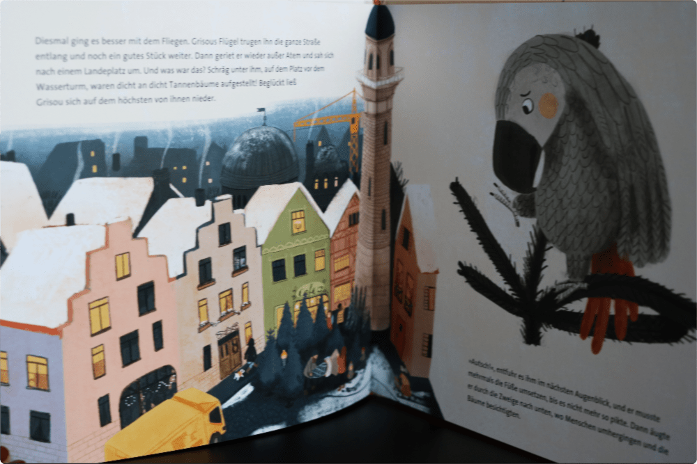Die modernen Illustrationen von Andrea Stegmaier werden vordergründig von gedämpften und naturbelassenen Farbpaletten bedient. So präsentiert sich das Bilderbuch in den unterschiedlichen Abstufungen von Grautönen, Beige und Orange. Es schildert die Sehnsucht nach Familie, Nähe und Heimeligkeit, trotz all des Trubels und der Aufregung, die so eine Vorweihnachtszeit mit sich bringt. Das eigentliche Nest und damit verbunden dieser gewisse Zug zurück zu dem Vertrauensvollen und Warmen, ist in der Weihnachtszeit so groß und bedeutungsvoll wie sonst nur selten im Verlauf des Jahres.