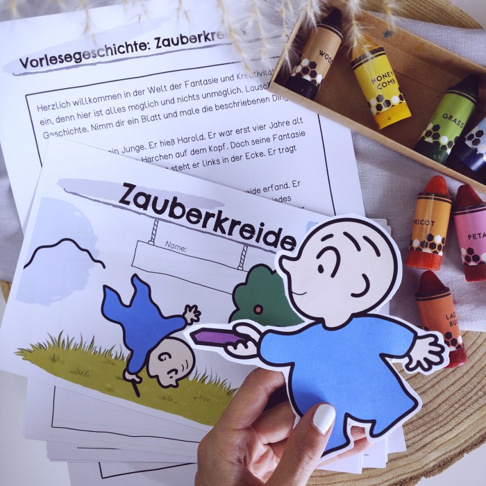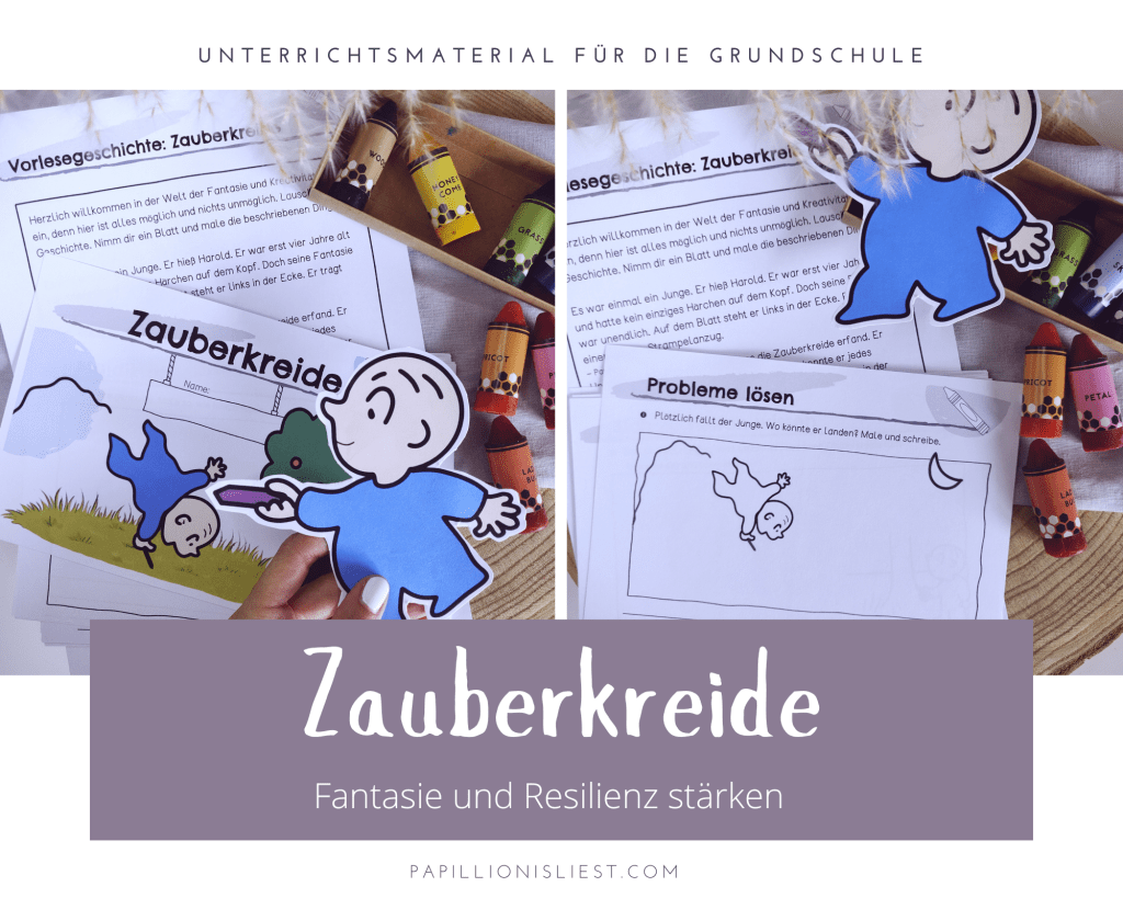 Das Bilderbuch „Harold und die Zauberkreide“ kann als Einstieg in dieses Thema genutzt werden. Der vierjährige Junge erweckt mit seiner imaginären Zauberkreide Dinge zum Leben, die er benötigt, um gewisse Probleme zu lösen. Er will den Mond besuchen, also malt er sich einen Weg in den Himmel. Als er sich auf seiner Reise verirrt, malt er sich ein Fenster zu seinem eigenen Zimmer und kehrt so sicher zurück. Wenn er Angst hat, läuft er nicht weg. Er benutzt die Zauberkreide als kreatives Instrument, um sich aus seinen Erfahrungen „herauszuzeichnen“ und ergänzt die Bausteine, die ihm für die Bewältigung fehlen.