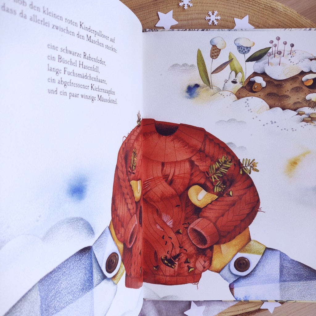 Der Förster findet den Kinderpullover am nächsten Morgen und betrachtet die Spuren, die von den Erlebnissen der letzten Tage berichten. Eine schwarze Feder, ein Büschel Hasenfell, Fuchsmädchenhaare, Kieferzapfen und Mäusekötel haben sich in die Maschen gezwängt.