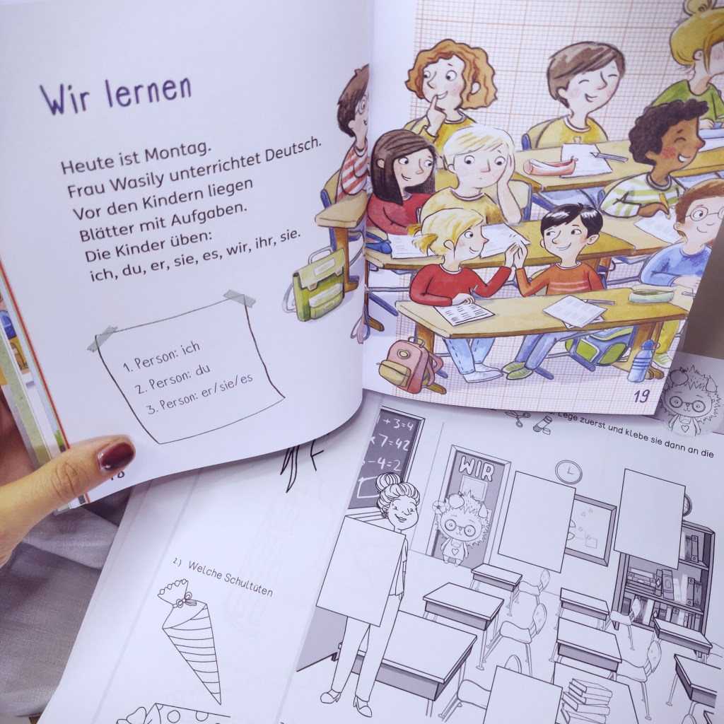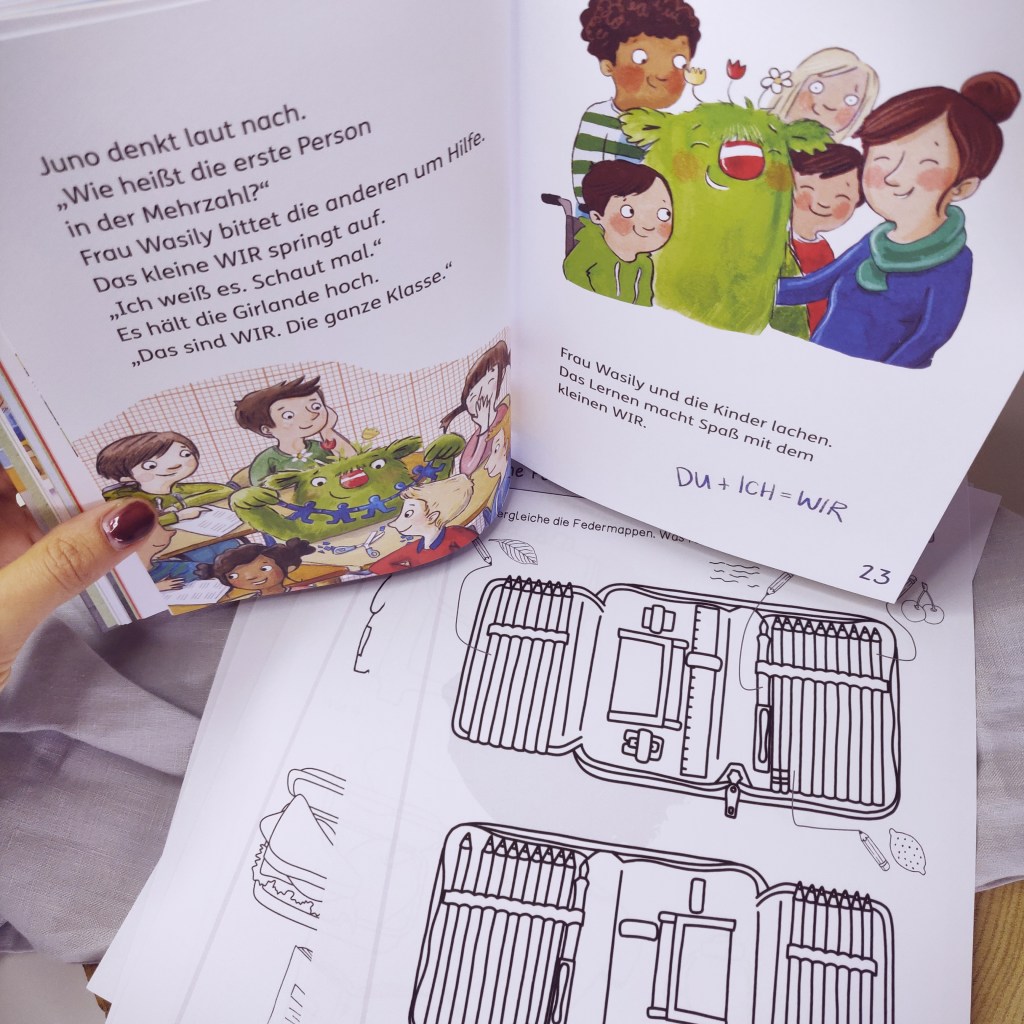 Die ersten Schulwochen nach der Einschulung bekommen Kinder Zeit, um anzukommen und ihre Klassenkameraden kennen zu lernen. Bei der Zusammenstellung der Aufgabenformate wurde darauf geachtet, dass die Arbeitsblätter Gesprächsanlässe bieten, wie gemeinsam gelernt werden kann, dass das WIR-Gefühl, sprich das Zusammengehörigkeitsgefühl in Verbindung mit Achtsamkeit, möglichst groß wird und bleibt.
